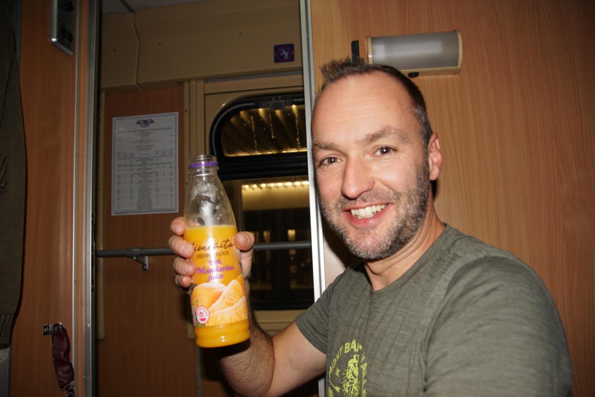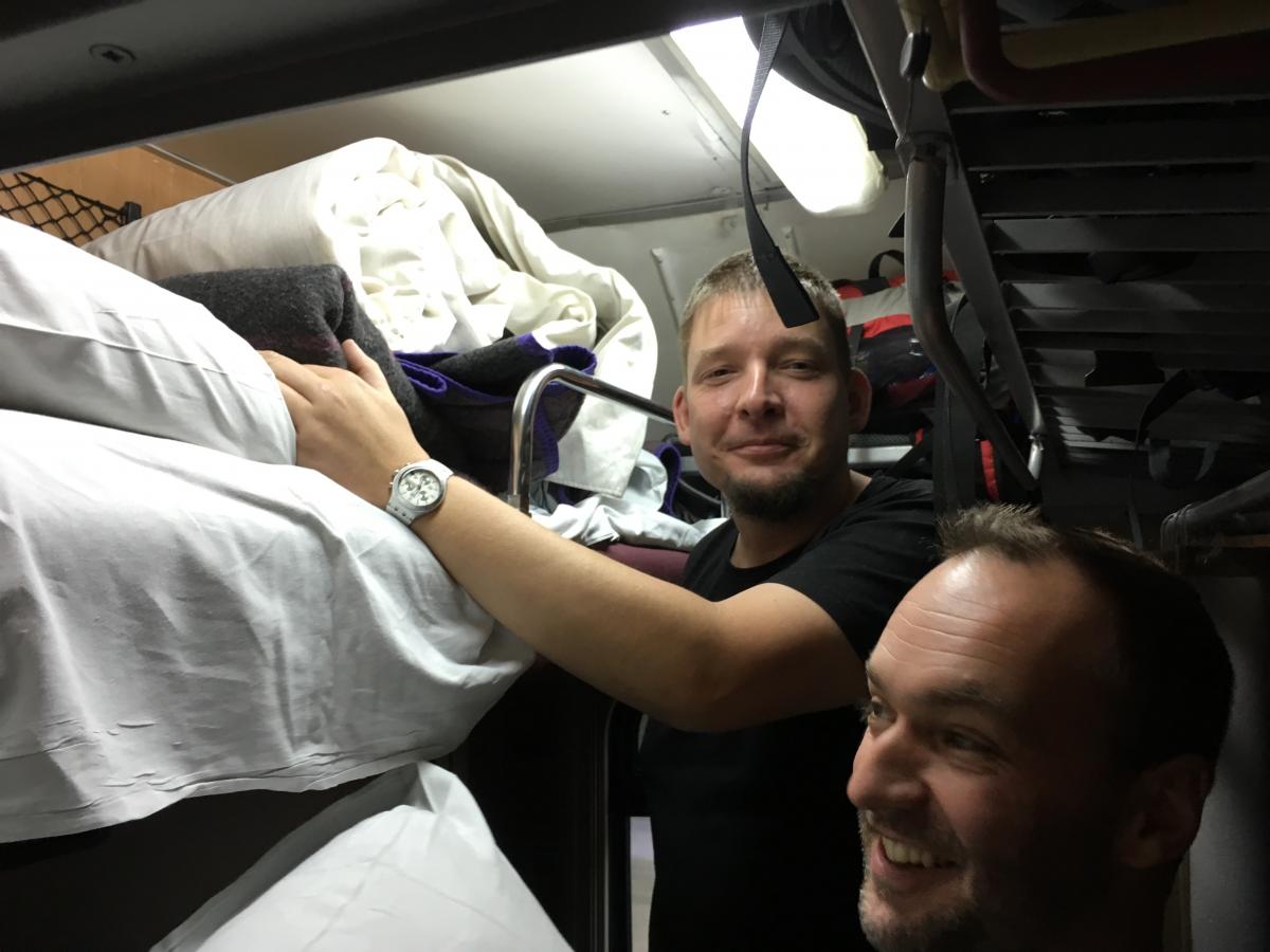 Abermals schaukeln wir über die Gleise, es geht vor und zurück, um jetzt in eine lange dunkle Halle einzufahren. Gerade zu gespenstig wirkt die Werkhalle. Es wird etwas heller und der Zug stoppt. Eine Stunde stehen wir hier, unser Domizil wird angehoben und unter uns werden die Fahrgestelle getauscht. Sind eigentlich unsere Pässe schon wieder da? Wir bekommen hier nix mit, nur der Hallenkran saust von Zeit zu Zeit über unsere Köpfe. Kein Fenster zum aufmachen und überall diese Schilder die das fotografieren verbieten. Ein Blick auf das Handy, ein Blick auf meine Uhr und wieder zurück. Die haben uns tatsächlich eine Stunde geklaut. Nach neuer Zeit ist es 00:10Uhr als wir die dunkle Halle mit neuen Fahrgestellen verlassen. Auch schon bei Schleichfahrt lässt sich feststellen, am Fahrkomfort hat sich nichts geändert. Apropos Fahrkomfort, wir stehen schon wieder. Im Augenwinkel sehe ich eine Tarnuniform vorbei huschen, unsere Pässe? Tatsächlich, wir bekommen unsere Pässe inklusive Einreisestempel der Ukraine zurück. Ein Uhr, für mich das eindeutige Zeichen ins Bett zu gehen. Die Aufbauarbeit stellt noch ein paar kleine Hürden. Kurz darauf liege ich im Bett für Personen bis 1,75m. Ich bin 1,83m.