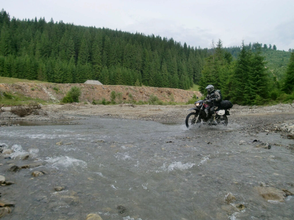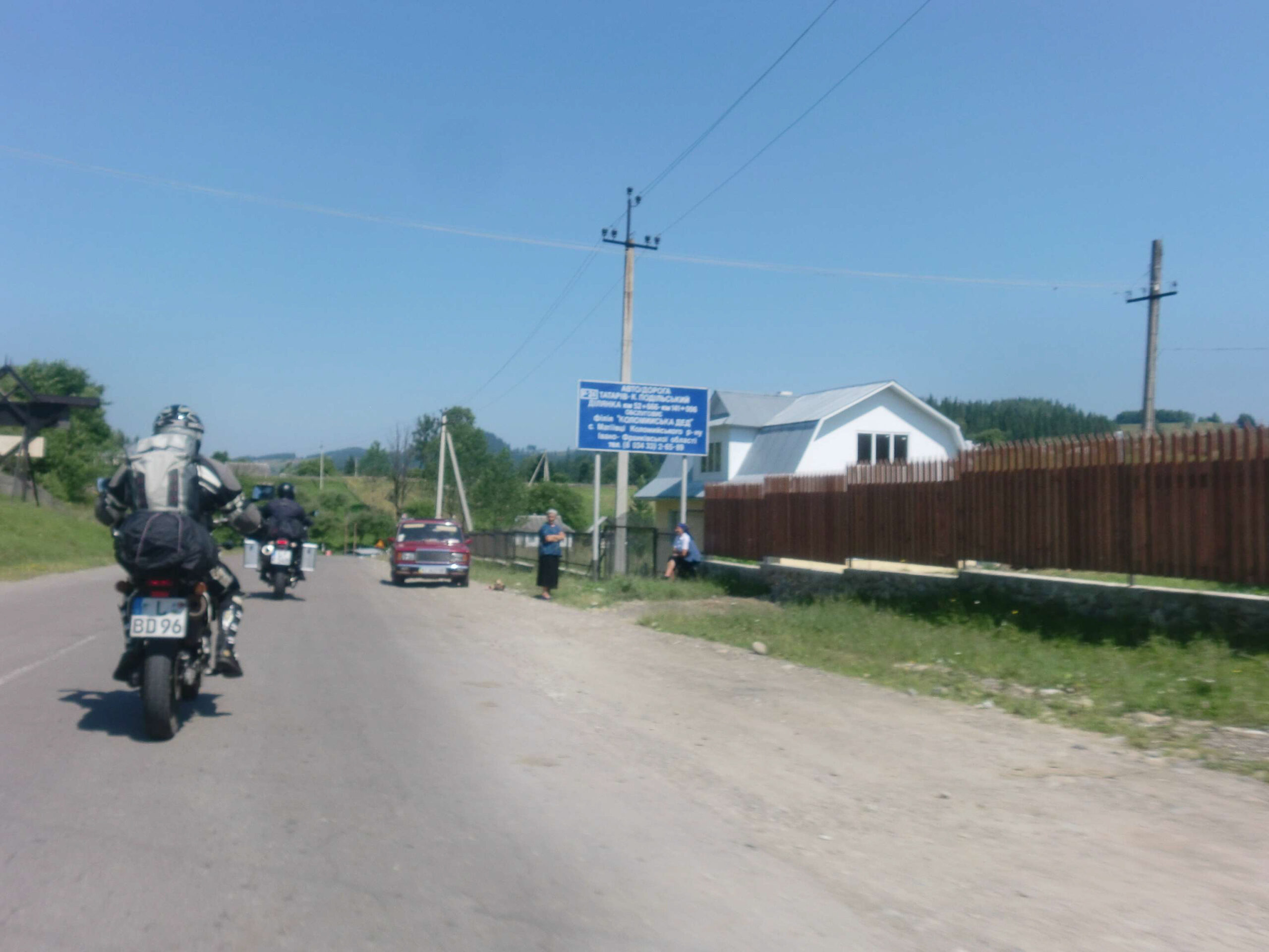Nach kurzer Suche finden wir den gut versteckten Grenzübergang. Kaum stellen wir unsere Motorräder ab, kommt schon ein netter rumänischer Grenzbeamter auf uns zu. Wir sollen nach vorne kommen, wir werden gleich mit abgefertigt! Klasse! Die Grenzbeamten beäugen unsere Maschinen und nebenbei auch unsere Papiere. Nach wenigen Minuten öffnet sich der Schlagbaum und wir fahren über den Grenzfluss zu den ukrainischen Grenzbeamten. Hier ist die Prozedur langwieriger und gleichsam komplizierter. Der Erste Beamte schreibt mein Nummernschild auf einen Zettel. Er übergibt mir diesen Zettel und ich kann ein paar Meter weiter fahren. Nun stehen wir alle wieder da, und das auch noch in der prallen Sonne. Der nächste Beamte kommt – Kontrolle aller Papiere. Also Reisepass, Grüne Karte und Fahrzeugschein. Mit dem Fahrzeugschein wird die Rahmennummer abgeglichen. Das Ergebnis kommt auf den Zettel von vorhin. Alles zurück bekommen, dürfen wir uns am Grenzerhäuschen anstellen. Immer noch pralle Sonne. Stück für Stück geht es voran. Nun kann auch ich den ganzen Kram ins Häuschen reichen. Hier wird das Ganze in den Rechner eingegeben. Aha, deswegen kein Grenzübertritt, wenn ein Computer streikt. Dann noch zum zweiten Fenster. Nochmal anstehen, nochmal alles abgeben, nochmal Computercheck und dann noch ein Stempel auf den Zettel. Jetzt kommt auch endlich der ersehnte Stempel in meinen Reisepass. Auf das Motorrad und los geht’s. Wenige Meter später werde ich gestoppt. Ein weiterer Beamter hat hier seinen Wirkungsbereich und sammelt die Zettel vom Anfang ein. Kurz gekramt, glücklich gefunden, um dann den Zettel gern zu übergeben. Endlich da! Wir haben die EU verlassen und befahren nun ukrainischen Boden.