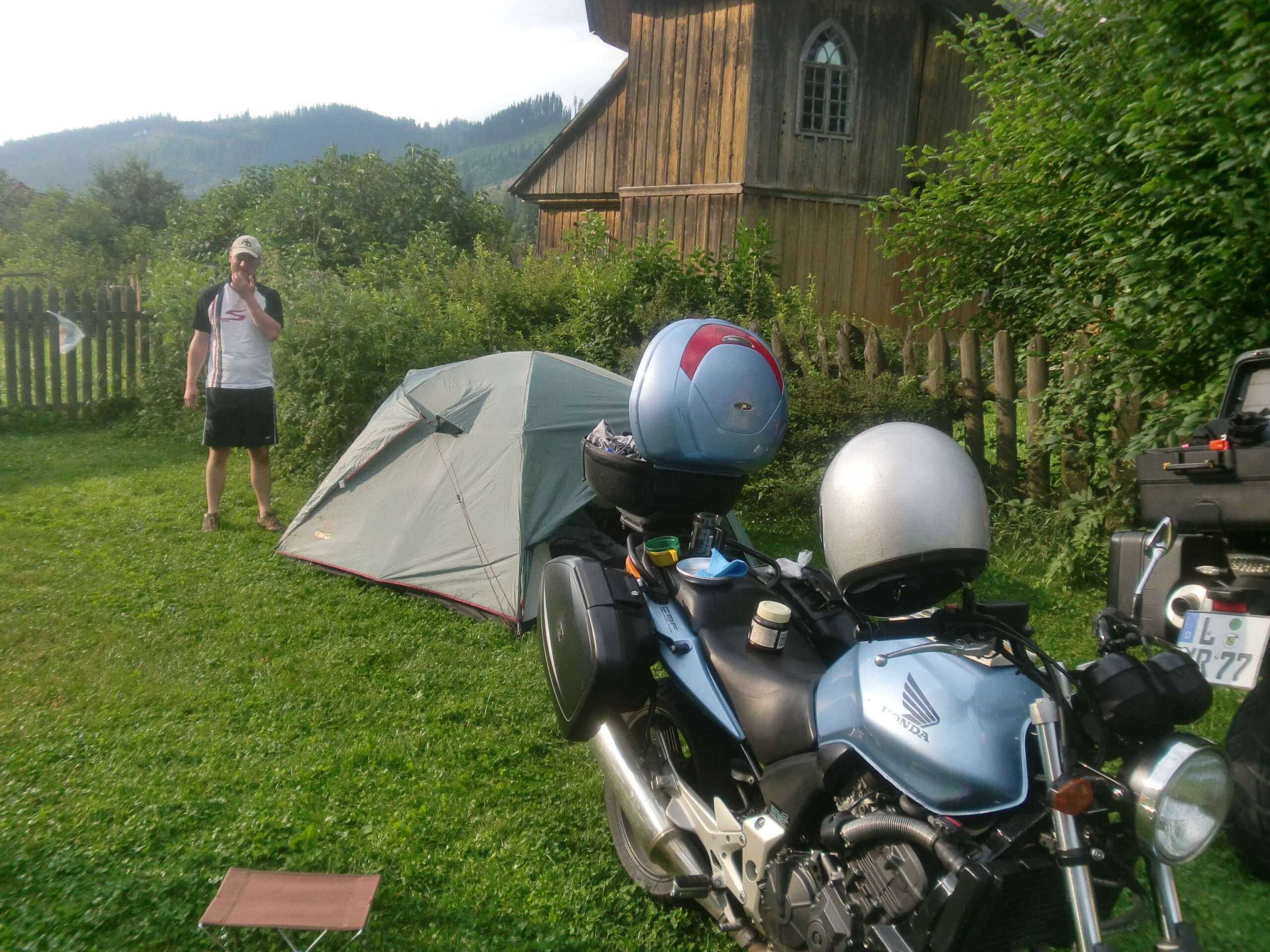 Während dieser Pflichtkilometer sinniere ich über meine „Grenzerfahrungen“ der letzten beiden Tage. Die Hauptfrage ist klar für mich: Was qualifiziert einen jungen Menschen zum Grenzer? Wahrscheinlich kommt der größte Teil der Beamten nach einer Abweisung in der Schauspielschule zum Grenzdienst. In der Schauspielschule mit Sicherheit unfähig, lustige oder glückliche Momente zu spielen, erweisen sie sich sofort tauglich für Passkontrollen. Anders kann ich mir einfach diese Gefühlskälte nicht erklären. Ich hatte ständig das Bedürfnis, mich für meine Grenzübergänge entschuldigen zu müssen. Mundwinkel, die auch nur im Ansatz nach oben gingen? Fehlanzeige! Vielleicht hatten wir nur schlechte Tage erwischt, egal. Rausgerissen aus meinen Gedanken halten wir plötzlich in einem Dorf. Kurz nach 19Uhr ist es schon. Ich versuche den Grund des Stoppens zu erahnen. Nun sehe ich es, ein unscheinbares Schild kündigt in wenigen Metern einen Zeltplatz an. Nach einer kurzen Absprache entschieden wir uns für diesen idyllisch gelegenen Platz.