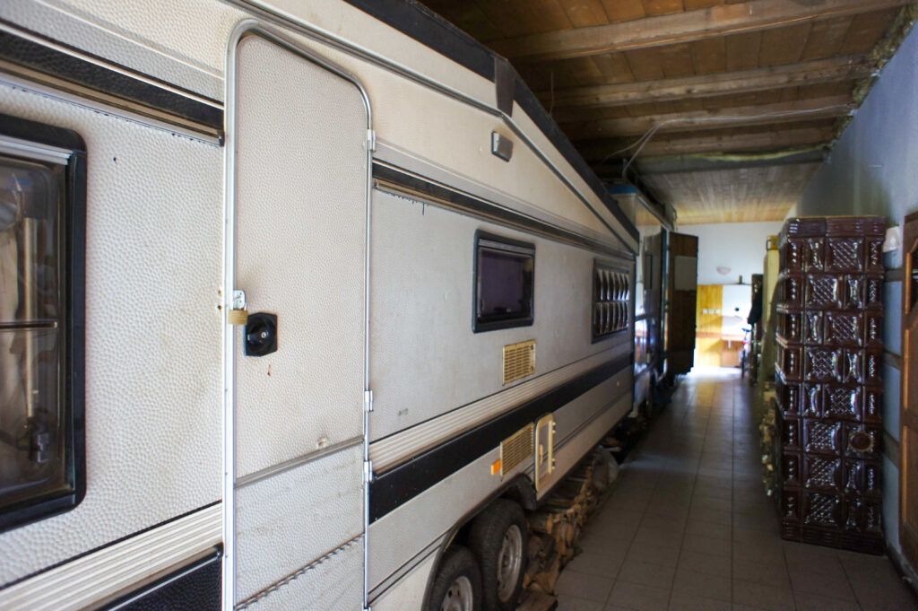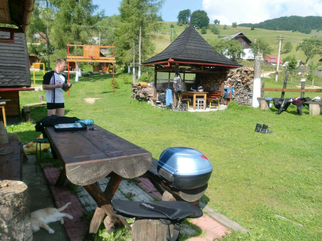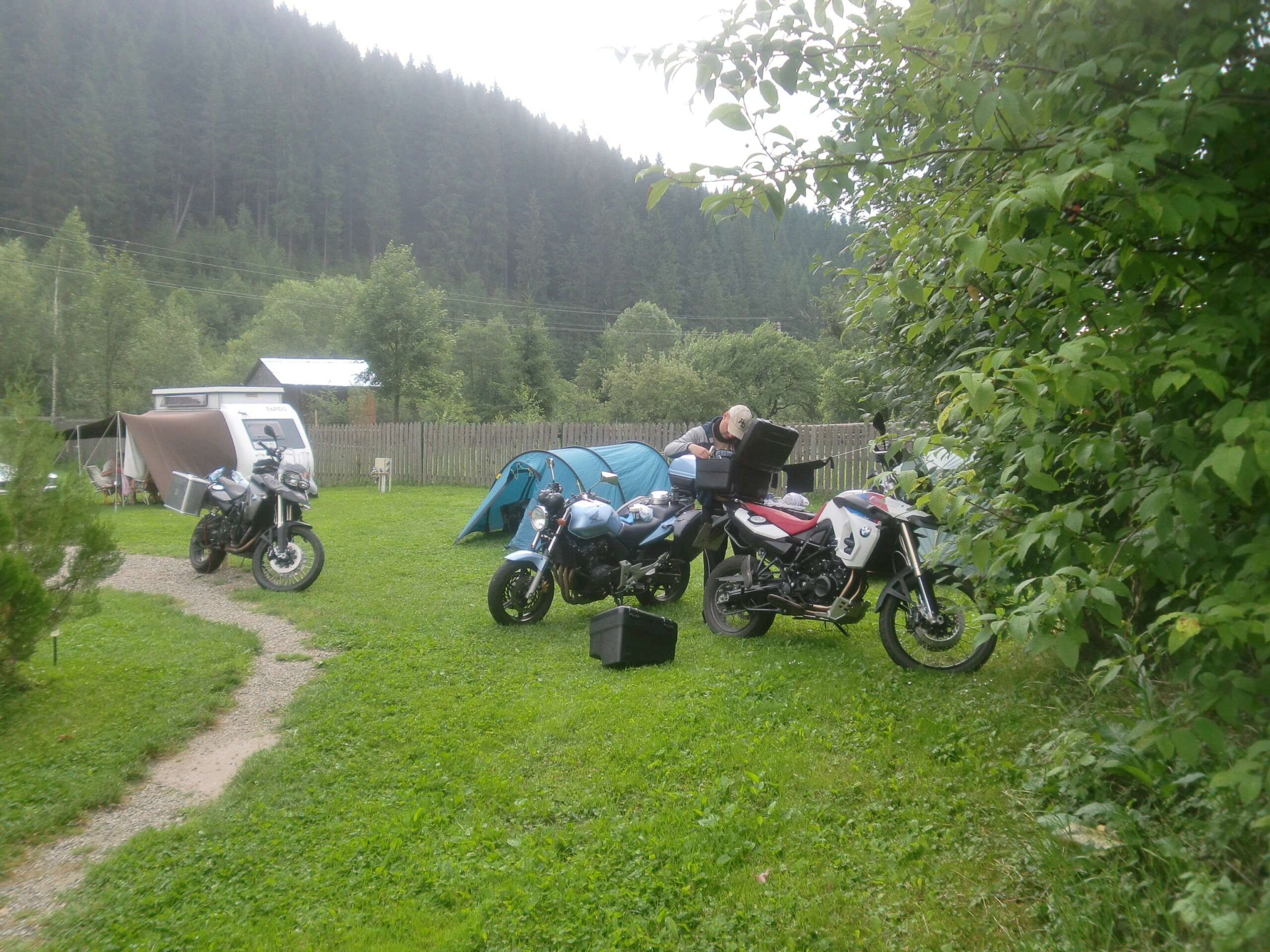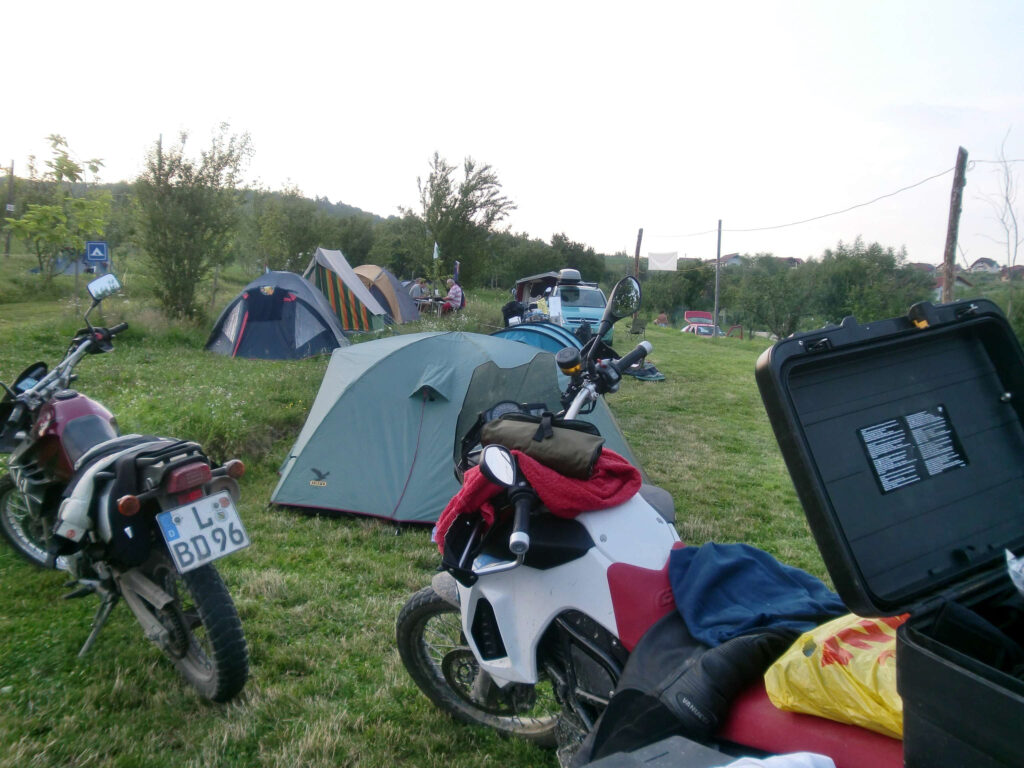 Genau zur richtigen Zeit erreichen wir einen schön gelegenen Campingplatz. Dieser Platz wird von einem alten Rumänen geführt, der uns mit seiner Riesenbrille und fleckigem, ehemals weißem Unterhemd und Shorts empfängt. Er ist freundlich und zeigt sich sehr interessiert an unseren Bikes. Auf unsere Frage hin, warum er so fließend deutsch sprechen kann, teilt er uns mit, dass er mit 20 Jahren nach Deutschland ausgewandert sei. Nun ist er mit seinem Wohnmobil und Wohnanhänger zurück und wird hier bleiben. Bevor wir uns entschließen können zu bleiben, checken wir aus Erfahrung erst mal die sanitären Einrichtungen. Wir erblicken nicht nur ausreichend gepflegte und gekachelte Räume, sondern auch das Wohnmobil samt Anhänger eingebaut im Haus. Es steht quasi im Flur zwischen Bad und Küche!