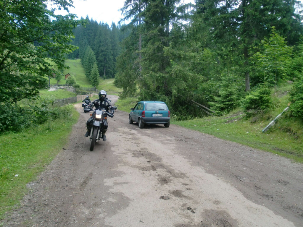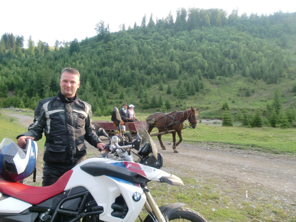 Gleich nach der Grenze halten wir an einer Tankstelle. Micha bekommt für seine GS eine neue H7 Lampe und gemeinsam stärken wir uns mit Coca Cola aus Dosen und weiteren Süßstoffen. Auf den folgenden, größtenteils langweiligen geraden Pisten geht es zurück in die Berge der Karpaten.