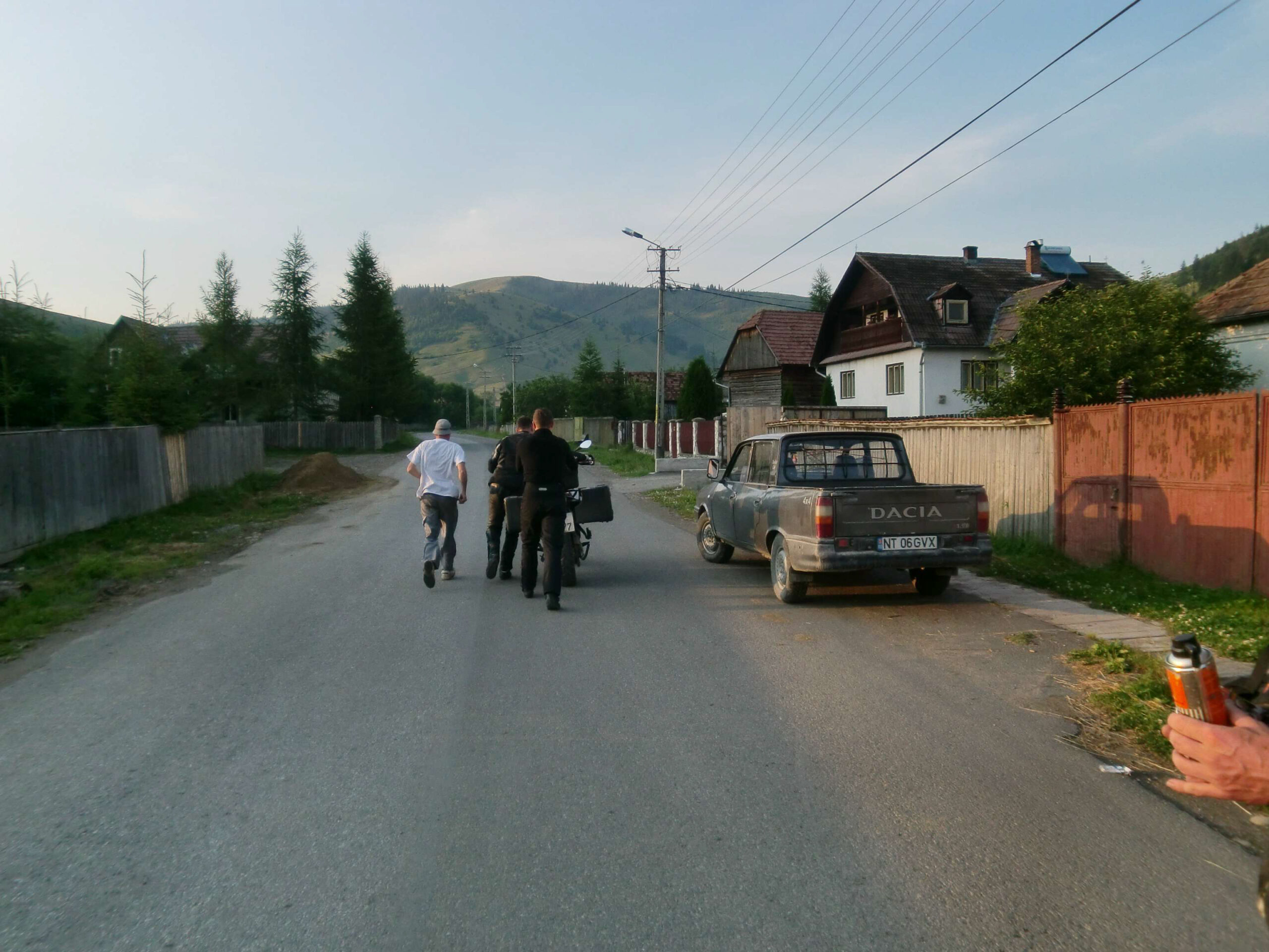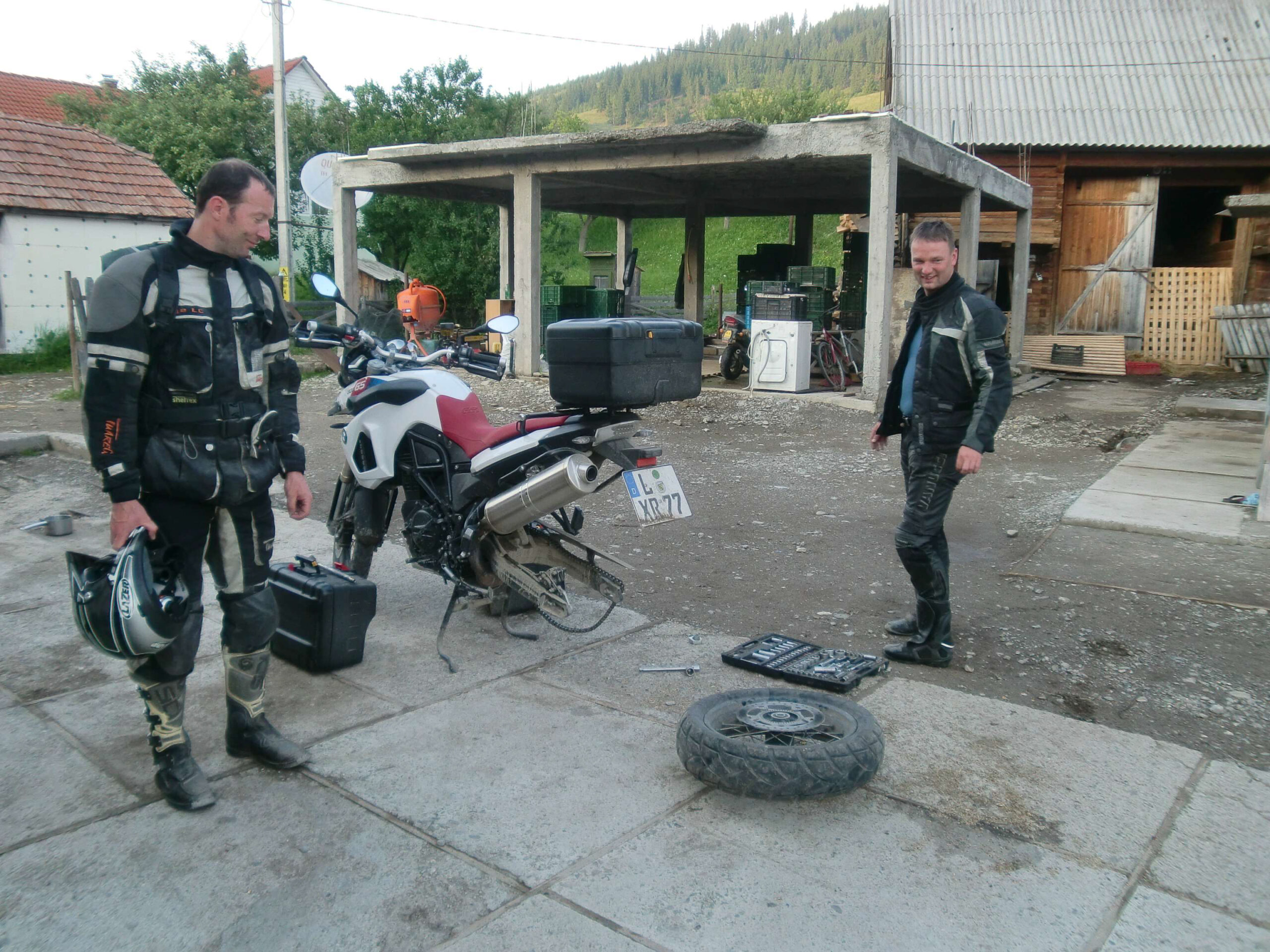 An der nächsten Kreuzung gibt es eine Navigatorenkonferenz. Ich nutze die Zeit und kontrollierte mein Bike. Meine Begeisterung über das Auffinden der Störquelle hält sich sehr in Grenzen. Platten am Hinterrad. Die letzten schönen Kilometer sind wie weg geblasen, es gibt nur noch dieses Problem. Mein Elektrotechniklehrer in der Meisterschule sagte immer: „Es gibt keine Probleme, nur Aufgaben!“ Also, das Problem ist gelöst und wir stehen ca. 1200km von zu Hause entfernt mit einer Aufgabe auf einer Dorfstraße. Etwa 20 Meter entfernt steht ein Rumäne der unser Treiben beobachtet. Matthias schließt sich mir an und wir gehen nach einem Vulkaniseur fragen. Der Kollege ist recht pfiffig und wir unterhalten uns mit Händen und Füßen. Das Ergebnis ist eher ernüchternd. Der nächste Vulkaniseur ist 10km entfernt und öffnet erst wieder, wenn die Sonne auf der anderen Seite steht.