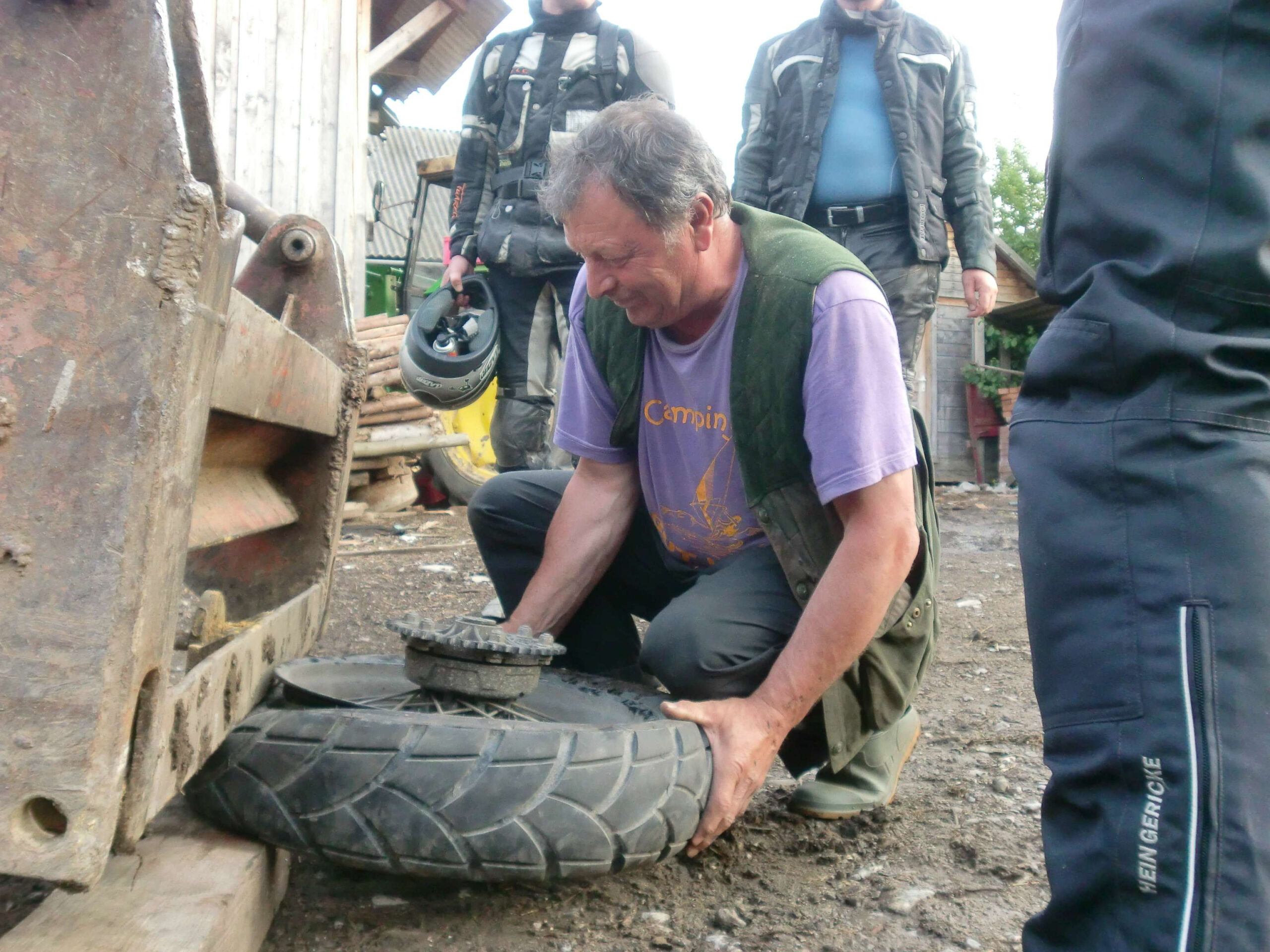 Wir überlegen noch, was wir machen, da gibt uns der Rumäne zu verstehen, wir sollen das Motorrad in seinen Hof rollen. Mein Gefühl sagt mir, dass dies schon in Ordnung sein wird. Kaum steht die kranke GS auf dem Hof, geht ein wildes Treiben los. Innerhalb weniger Minuten ist das Hinterrad ausgebaut und zwei Rumänen machen sich daran, den Reifen abzuziehen. Ich stehe etwas neben mir und kann nur staunen, hoffen und Brot essen. Brot essen? Ja, wir sind anscheinend beim Bäcker des Dorfes gelandet. Die Bäckersfrauen bringen frisches Kartoffelbrot und erfreuen sich daran, dass es uns sichtlich mundet. Die zwei Reifenspezialisten rennen nun auf einmal mit meinem Rad über den Hof. Zögerlich folgen wir ihnen. Ich höre einen Dieselmotor starten und sehe, wie eine mittlere Landmaschine vorgefahren kommt. Schnell die Gabel abmontiert steht dieses graue Monster direkt vor meinem Rad. Damit soll nun das Reifenabziehen gelingen. Was am Anfang sehr abenteuerlich aussieht, entwickelt sich zu einer sauberen Sache. Der Schlauch ist draußen und kann mit handelsüblichem Fahrradflickzeug repariert werden. Meine Anspannung entweicht Stück für Stück. Als das Rad wieder eingesetzt ist, will ich mich mit 20€ für die gut geleistete Arbeit bedanken. Er weigert sich jedoch vehement mein Geld anzunehmen. Uwe hat noch eine clevere Idee. Er schaut in sein Wörterbuch und bestellt noch ein Brot zum mitnehmen. Dieses werden wir ja wohl bezahlen können, denken wir. Denkste! Geschenkt wird es uns. Die Rumänen stöbern mit Freunde im Wörterbuch von Uwe. Sie bestellen mit nettem Akzent „Einen Kaffee zum mitnehmen“ und andere Verse aus dem Reiseführer. Fast schon zur Familie gehörend, machen wir noch ein Abschiedsfoto und verlassen glücklich nach einer Stunde mit einem frischen Brot und ganzem Reifen den Hof.