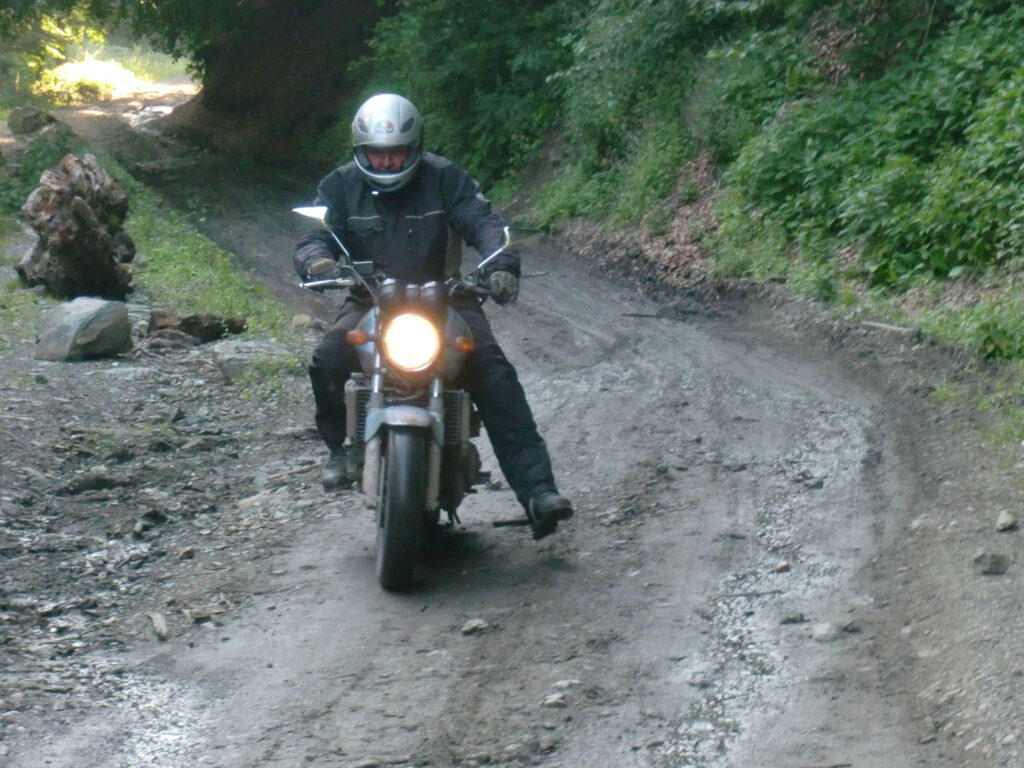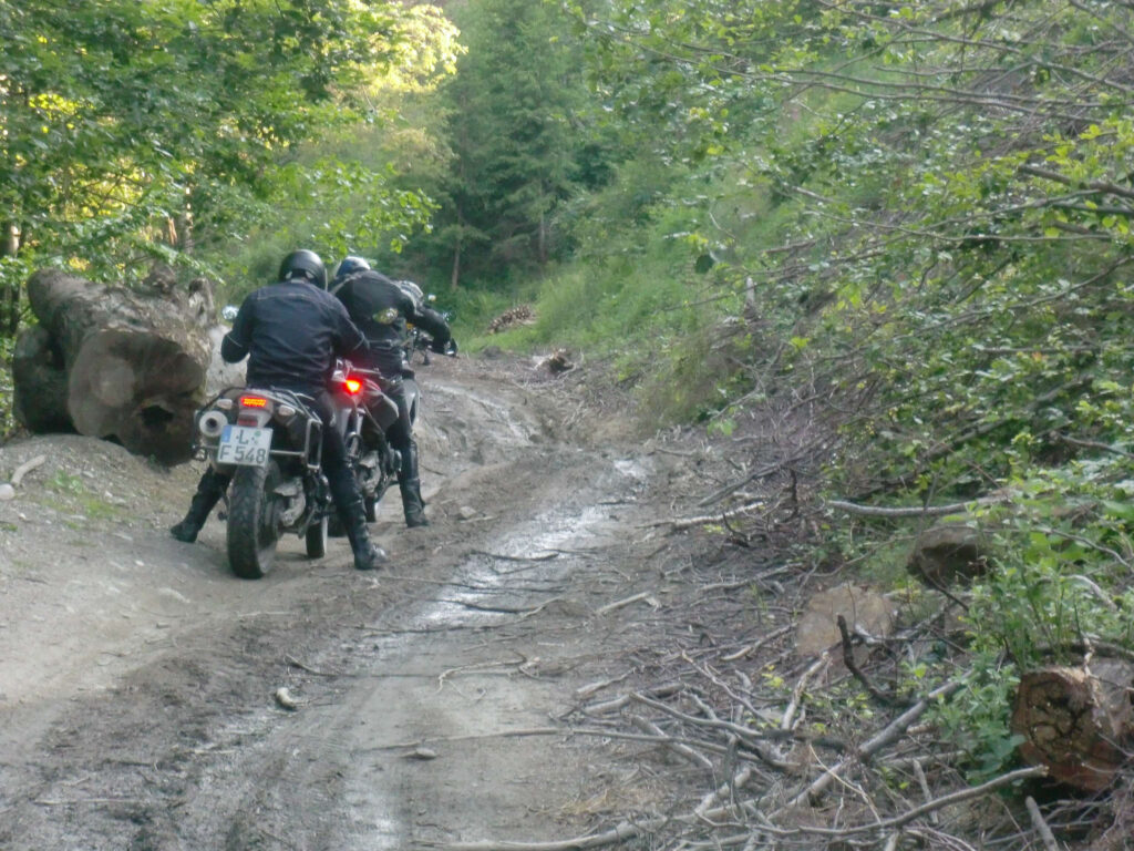 Nach diesen schönen Eindrücken fahren wir in einem Dorf in eine kleine Seitenstraße ein. Was ich hier sehen kann, ist alles andere als schön. Es ist eine von Zigeunern bewohnte Straße. Die Leute, welche die sich hier rumtreiben – ich denke mir gleich: „Mach mal lieber dein Visier runter.“ Die „Straße“ endet am Fuße eines Berges den Micha erkunden will. Der letzte Bauernhof hat zu allem Überfluss noch einen bösartigen Hund. Er rennt auf Micha und mich böse blickend und laut bellend zu. Für mich gibt es nur eine Reaktion, Gas und weg! Micha bleibt stehen!!? Auf Nachfrage erfahre ich dann, dass er seine GS abgewürgt hatte. Da ich mich durch den Hundekick nun an die erste Stelle gesetzt habe, kann ich in voller Fahrt den Berg bezwingen. Immer schwerer wird die Auffahrt. An geeigneter Stelle warte ich auf den Rest der Truppe. Hat der Hund einen Reifen zerbissen? Und was macht Uwe mit der CBF an diesem Berg? Alle kommen gut hoch und wollen noch etwas mehr. Ein paar 100 Meter später warten tiefe Schlammlöcher auf uns. Matthias passiert ohne Probleme. Ich wartete noch einmal auf den Rest der Truppe. Nun ergibt sich folgendes Bild: Matthias auf der einen Seite, Uwe, Micha und ich auf der anderen Seite der Schlammlöcher. Nach kurzer Beratung beschließe ich, Uwe eine Vorführung über eine Durchfahrt eines Loches zu geben. Das dies nicht besonders clever ist, steht schon vor Ort fest. Ich will es aber unbedingt testen. Gut durchs Schlammloch geschlittert stehe ich nun mit bei Matthias. Auf der anderen Seite ist die Gestik klar. Von den beiden wird keiner folgen. Wir kehren also um und fahren wieder an „Bello“ vorbei. Ich werfe einen vorsichtigen Blick in seiner Hütte- Er ist nicht da. Wahrscheinlich frisst er gerade eine Katze. Bloß weg hier!
