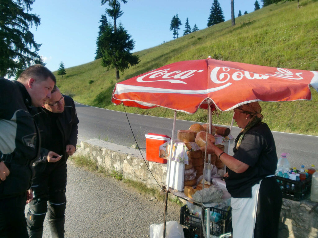 Auf dem Weg zu unserem Zeltplatz passieren wir noch ein paar Kehren auf feinstem Asphalt. Bei einem kurzen Stopp an einer Aussichtsplattform kauft Uwe noch etwas landestypischen Käse bei einem Mütterchen. Wahrscheinlich aus Hobbygründen drückt er den Preis von 16 auf 12 Lei. Ich habe noch mal genau hingesehen, ein kleines Lächeln ist unter der Ledernen Haut des Mütterchens trotzdem zu erkennen.
