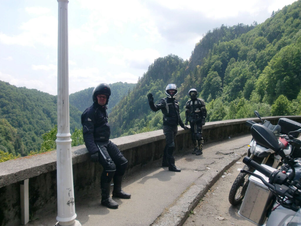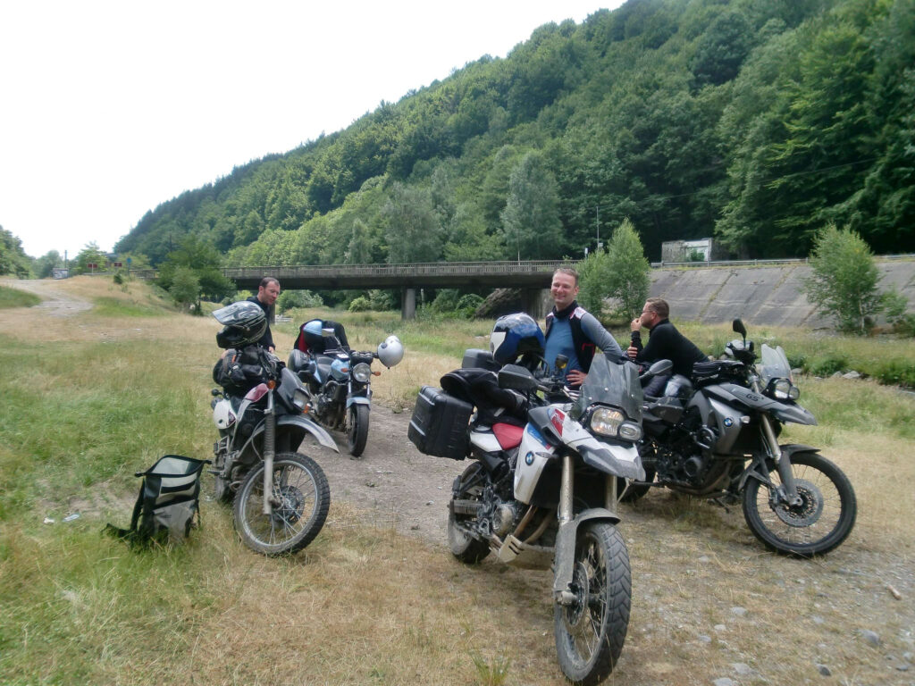 An der KLR bricht eine kleine Nase am linken Schalterelement. Matthias bleibt trotz des kleinen Schadens gelassen. Was Ihm mehr Sorgen bereitet, sind die Hochspannungsmasten. Er gibt zu bedenken, dass wir uns unter ihnen aufladen. Mit meinen Elektrotechnikwissen kann ich mir das zwar nicht erklären, aber besonders sympathisch ist mir das knistern auch nicht. Wir entscheiden uns schnell weiter zu fahren, um dann an geeigneteren Stelle zu pausieren. Ein paar hundert Meter später finden wir im Schatten einiger Bäume einen Pausenplatz. Mit etwas ISO- Band können wir die KLR reparieren. Die Weiterfahrt ist gezeichnet von höchsten Temperaturen, anspruchslosen Straßen und staubigen Stadtdurchfahrten. Die Außentemperaturanzeige meiner GS kennt nur eine Richtung. Keiner meiner Mitfahrer möchte mehr eine Info über die aktuelle Temperatur. Ist Hitze besser zu ertragen, wenn man nicht weiß wie heiß es ist?? Meine Gedanken sind immer wieder bei Micha, der bei diesen Temperaturen auf der Autobahn und durch Millionenstädte fahren muss. Die Abendstunden näheren sich und wir fahren parallel zu einem Fluss in die Westkarpaten ein. Die Temperaturen gehen unter die 30° Marke. Schön! Und dazu endlich wieder Kurven.