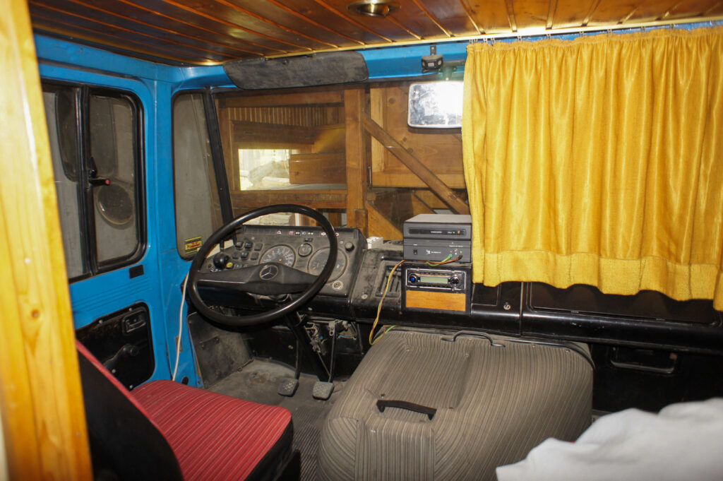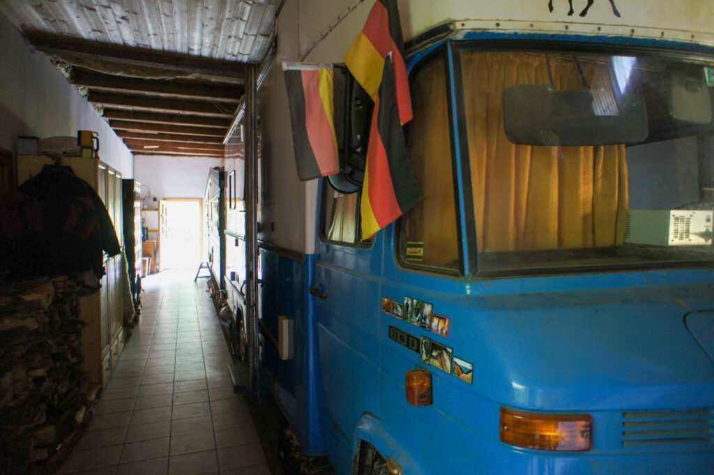 Nach dem Zeltabbau kümmere ich mich um die Finanzierung der letzten Nacht. Ich nehme gleich noch mal meinen Fotoapparat mit, da ich das eingemauerte Wohnmobil unbedingt noch auf meine Speicherkarte bannen möchte. Der Zeltplatzchef erwischt mich beim fotografieren und gibt mir ohne zu Fragen einen geschichtlichen Abriss über seine Anreise vor mehr als 10 Jahren. Er zeigt mir gern die Inneneinrichtung und zieht dann noch das ein oder andere Fotoalbum aus der Versenkung.
