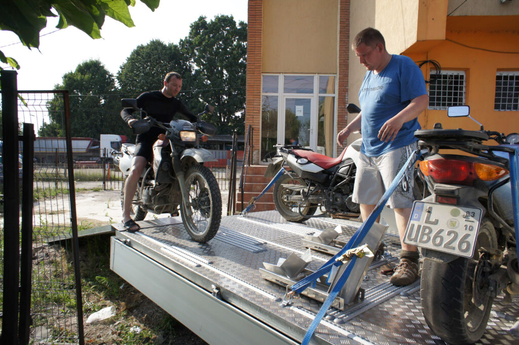 Kurz vor der Autobahn sammeln wir Micha ein, zu dritt düsen wir die verbleibenden 190 km bis Berlin. Es fehlt noch der Matthias, um seiner Kawasaki KLR und sich eine schnelle Autobahnhatz zu ersparen schon eine halbe Stunde vor uns startete. Als er kurz nach uns bei der Autovermietung auftaucht, ist Uwe mit seiner Honda CBF bereits auf dem Transporter. Unsere Runde ist komplett, so soll es für den Rest der Woche bleiben. Mit vereinten Kräften beladen wir den Transporter. Die „Berliner Schnauzen“ der Vermietung sind äußerst freundlich und hilfsbereit. Sie geben uns gern einige gute Tipps zum Beladen und bringen uns auch noch einen Kaffee zu Stärkung. Meine BMW F800GS soll als zweites auf den Transporter. Vor dem hochfahren über die Rampe beschleicht mich kurz ein flaues Gefühl. Die Berliner Schnauze sagt nur kurz: „Wer da nicht hoch fahren kann, braucht auch nicht in die Karpaten fahren“, damit sollte die Dame Recht behalten. Also hoch fahren und gut. Bald sind zwei Stunden vergangen und die Motorräder stehen auf der Ladefläche.