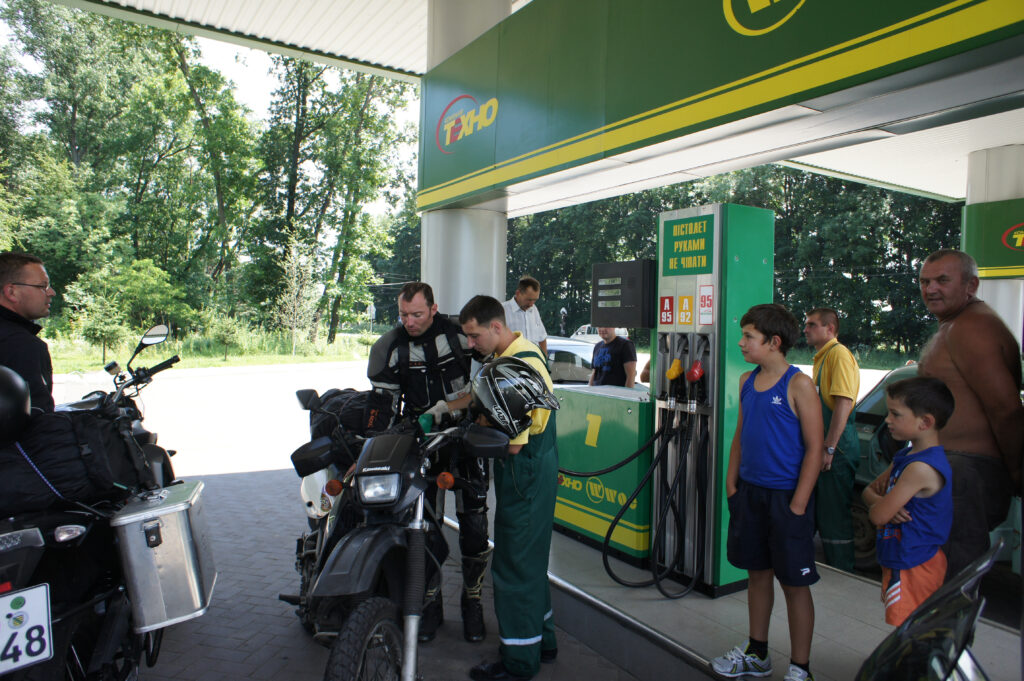 Die Häuser am Wegesrand sind zum größten Teil schön herausgeputzt. Helle Fassaden und glänzende Dächer prägen das Bild. Überall sind Menschen auf den Beinen, wo die nur alle hin wollen? In einem Dorf halten wir, um auf die Karte zu schauen. Da ich mich aus Navigationsaufgaben gern heraushalte, gehe ich mit Matthias in einen Konsum. Wir sprechen uns kurz ab, ob wir wohl vorher wegen der Bezahlung fragen sollten. Besser nicht! Wir nehmen uns Wasser, welches am meisten vergriffen ist (wie wir kurz darauf feststellen müssen, ist es gesalzenes Wasser), suchen Kekse heraus und etwas Schokolade. Alles zusammen mit einem 5 Euroschein auf den Kassentisch. Erst ist der Blick des jungen Kassierers etwas ungläubig, kurz darauf ein verschmitztes Lächeln. Er holt sein privates Portemonnaies aus der Tasche und alles ist möglich. Bei diesem glücklichen Gesicht ist noch eine Schokolade mehr drin! Matthias sucht schnell noch eine aus und legte sie mit auf den Tisch. Wir bekommen ein paar UAH zurück und gehen wieder zu den Mopeds.