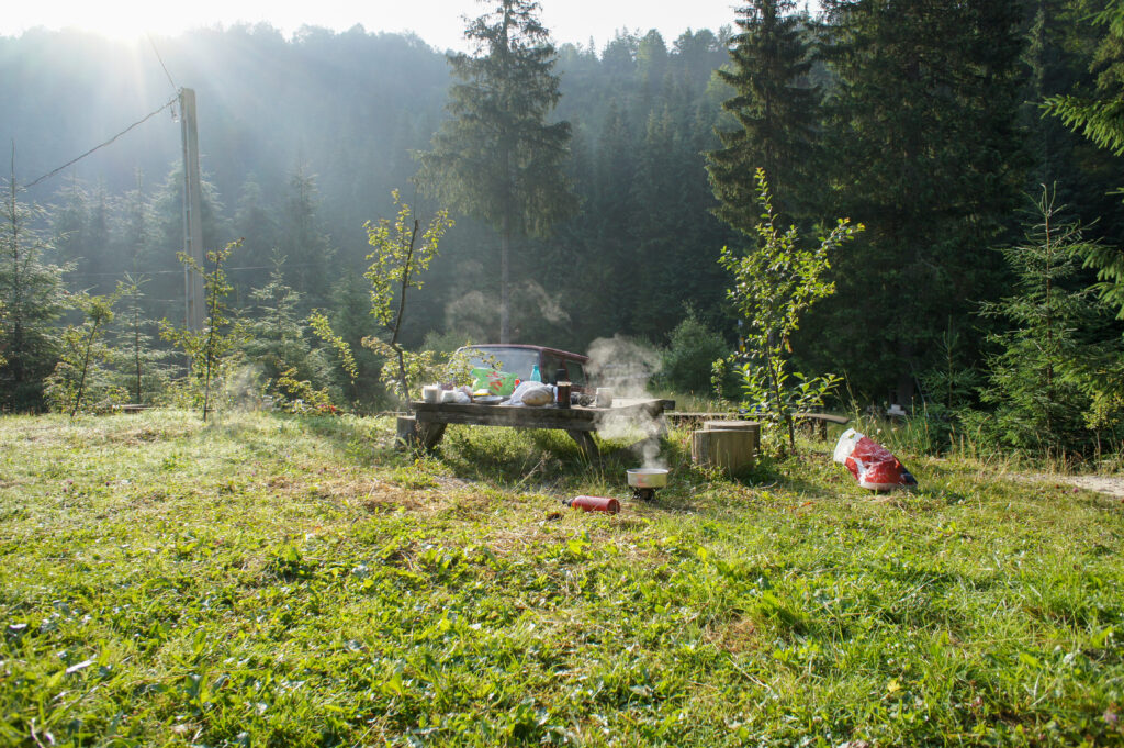Am letzten Morgen unserer Karpatentour bauen wir nur noch ein einziges Zelt ab. Matthias hat freiwillig, aus Abenteuerlust, oder auch wegen Lustlosigkeit zum Zeltaufbau unter freiem Himmel geschlafen. Die Nacht war für ihn nicht sonderlich erholsam. Hunde kämpften lautstark in der Nachbarschaft und die Hauskatze des Zeltwartes sah im Licht der Stirnlampe auch sehr skurril aus. Einzig und allein Ohropax brachten die Ruhe für einen seligen Schlaf. Wahrscheinlich hat er dadurch die einzige Möglichkeit verpasst, einen Bären bei der Nahrungssuche zu beobachten. Meine Nacht war dagegen wenig spektakulär. Ich wache von allein auf, obwohl der Morgen nicht so drückend warm ist. Die Sonne kämpft noch mit dem letzten Berg, um uns später wieder ordentlich einzuheizen. Beim Blick über das Gelände sehe ich, dass Uwe schon das Frühstück vorbereitet hat. Der Dampf des Kaffeewassers verbindet sich eindrucksvoll mit den ersten Sonnenstrahlen, welche sich langsam über den Karpaten erheben. Ein toller Morgen.