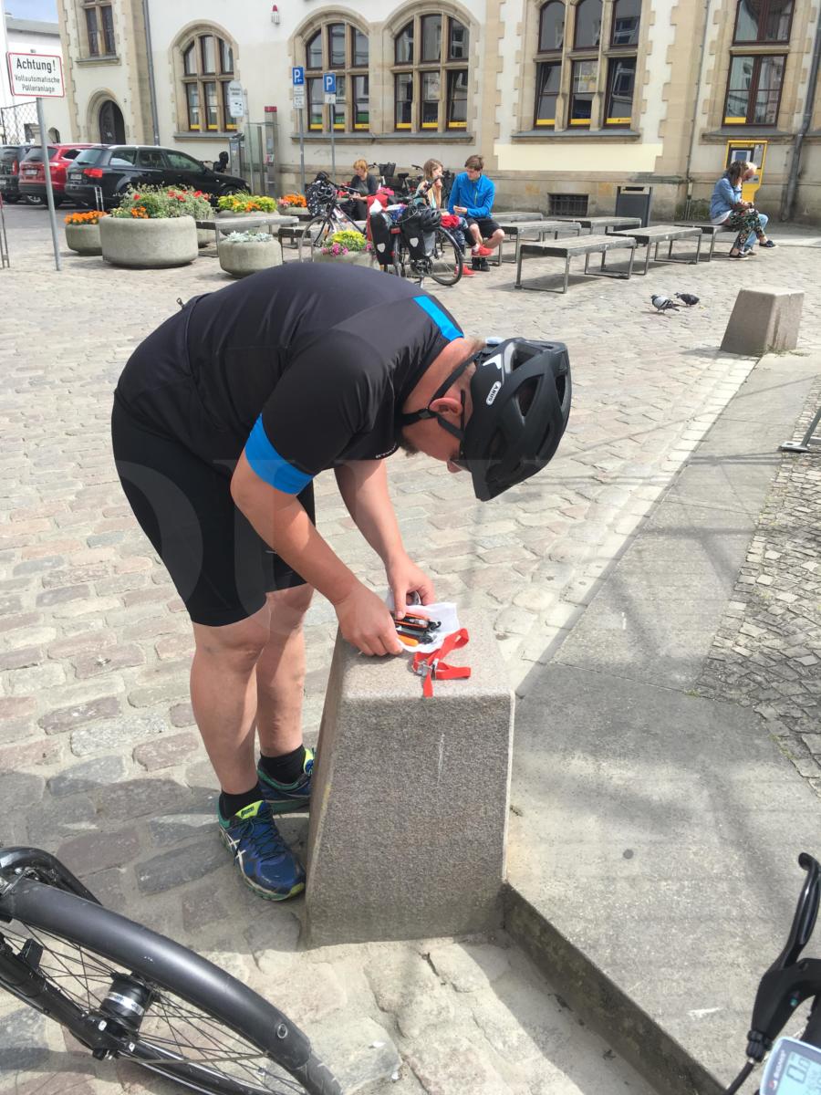 Knapp 50km sind abgespult und wir finden einen kleinen Platz in einer noch kleineren Ortschaft für unsere Mittagspause. Als Menü gibt es das kurz vorher gekaufte Baguette, dazu Frischkäse und ein paar Knacker. Als Abschluss soll es einen Kaffee aus Uwe’s Kaffeemaschine geben. Im letzten Urlaub am fehlenden Topf gescheitert scheint heute alles komplett zu sein. Wasser ist im Topf, Kaffeepulver ist in der French Press und der Gaskocher ist komplett. Feuer? Feuer! Kein Feuerzeug ist in der Schachtel, in die es laut Uwe zu 100% eingepackt wurde. Die Lösung steht hinter dem nächsten Gartenzaun und ordnet ihren Garten. Gerne entzündet die Dame Uwe’s Gaskocher und unserem Kaffeegenuss steht nix mehr entgegen. Im zusammen packen findet sich dann doch das Feuerzeug, welches uns sicher in den nächsten Tagen gute Dienste leisten wird.