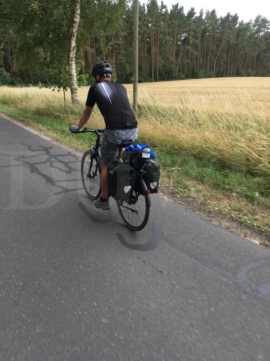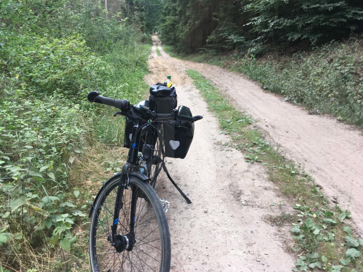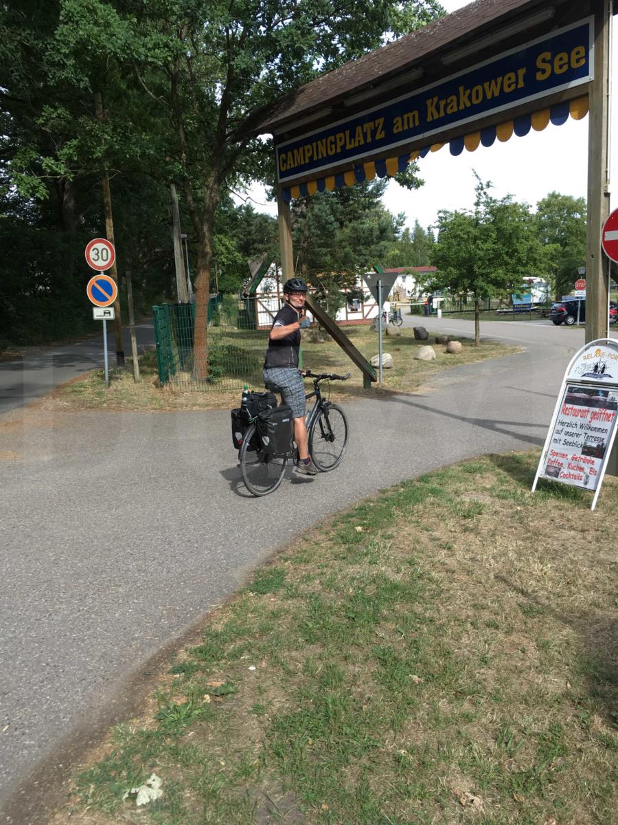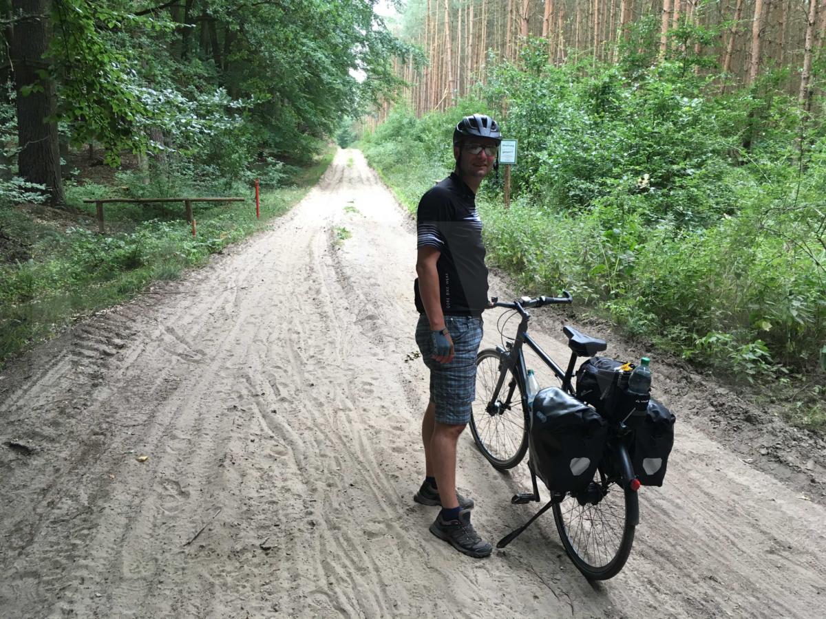 70 km stehen mittlerweile auf der Uhr, Uwe meldet die ersten Ermüdungen und ich gebe großspurig meine Power für weitere 30 km bekannt. Ich konnte es nicht wissen, die nächsten km gehen über unbefestigte Weg durch den Wald, das bedeutet viel Sand. Teilweise soviel das unser Fahrrad zum Schiebrad wird. Echt nervig und Kräfte raubend. Die ca. 4 km durch den Wald werden abgelöst von nicht minder schlecht zu befahrenden Kopfsteinpflaster. Alles in allem sind nun unser beiden Akkus leer und wir sind glücklich als nach über 83km unseren Zeltplatz in Krakow erreichen. Unser Bungalow liegt direkt am Wasser und gibt uns bestimmt eine erholsame Nacht.